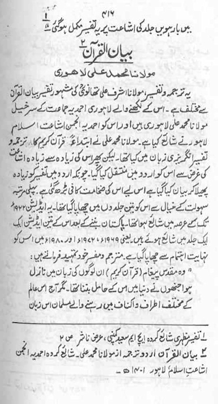 4. In the Urdu journal Fikr-o-Nazar, published by the Islamic Research Institute, International Islamic University, Islamabad, Pakistan, there is a lengthy article by Muhammad Arshad entitled Bar-i Saghir mein tafsir-i Quran ka kalami usloob or ‘Styles of exegesis of the Quran in the Indian subcontinent’ (vol. 41, no. 3, 2004, pages 13–17). On pages 20–21 it reviews Bayan-ul-Quran by Maulana Muhammad Ali.