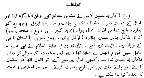 “Dr. Muhammad Husain was a renowned physician of Lahore. He was originally from Shakar Garh and was a friend of Iqbal. He was his class fellow till matriculation. He died on 26 April 1939 due to a stroke (Mujahid-i Kabir, 1962, p. 236). Colonel Dr. Bashir Husain, retired Director, Health Services, West Pakistan, is his son. He was a very wealthy and generous man, and gave thousands of Rupees for the propagation of Islam. He built the Samli Sanatorium and then handed it over to the government. Whenever Dr. Muhammad Husain Shah paid a visit to Iqbal, the Allama would stand up to greet him, and show him the same respect when seeing him off. The love and sincerity between them can be gauged from this.” (p. 159)
