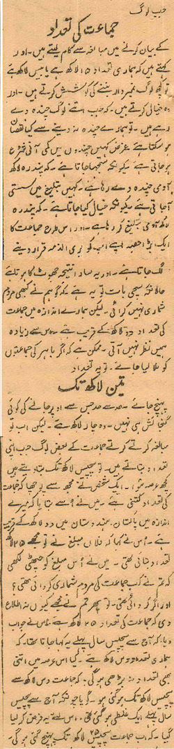 Some time ago a man asked me: How many people are in the Jama‘at? I told him that by my estimate it is about 200,000 in Pakistan and India. He said that a certain muballigh [missionary of the Qadiani Jama‘at] had told him that it is 2,500,000. I wrote to that muballigh and asked him: When did you conduct a census of the Jama‘at, and if you did, then why did you not let me know that the number of people in the Jama‘at is 2,500,000? He replied: