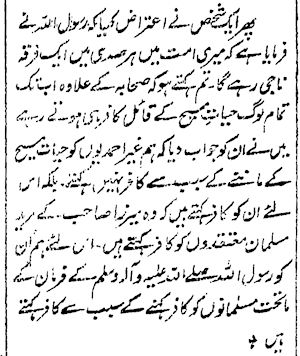 “Then a man raised the objection that the Holy Prophet has said that in every century there will be a group in his Ummah who will receive salvation, but you (i.e., Ahmadis) say that after the Companions till today all Muslims have been kafir as they believed that Jesus is alive. I replied to him that we do not call non-Ahmadis as kafir because of their believing in Jesus to be alive. We call them kafir because they call the followers of Mirza sahib, who are Muslims, as kafir. Therefore, under the Holy Prophet’s order, we call them kafir because they call Muslims as kafir.”